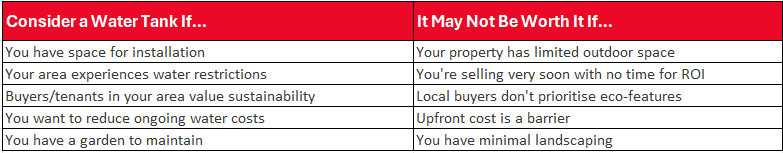 A water tank can be a valuable addition—but the impact on your property's value depends on your local market, buyer demographics, and council requirements.